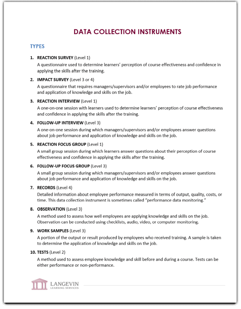But here’s the question. What are the best data collection tools that we can use at each level? Also, are there alternative instruments available? In our workshop, The Successful Training Manager, we categorize all the instruments by their level.